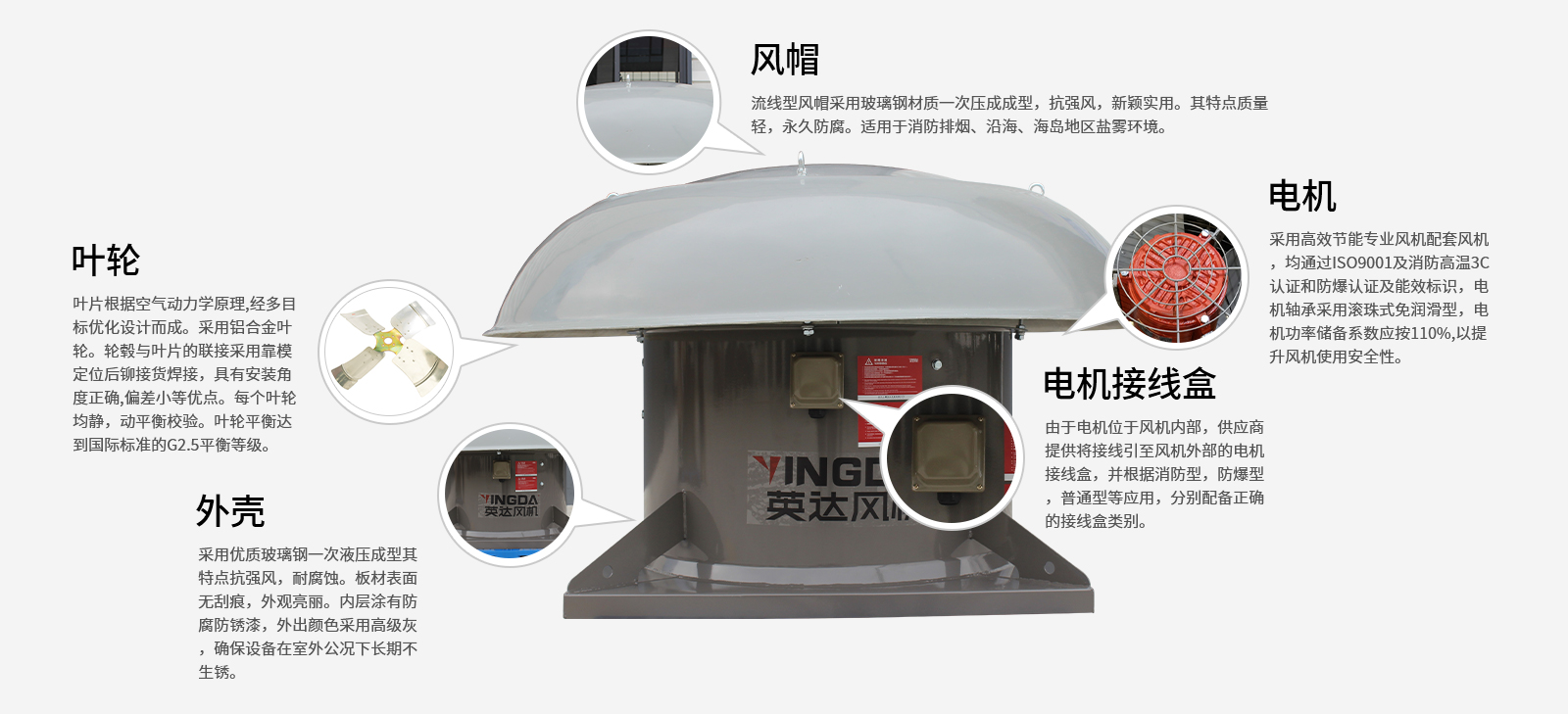 鋼(gāng)製屋頂風機機殼采用整體(tǐ)旋壓翻邊而成,玻璃鋼屋頂風機機殼為玻璃(lí)鋼一次成(chéng)形,風機風帽為玻璃鋼一次成形。