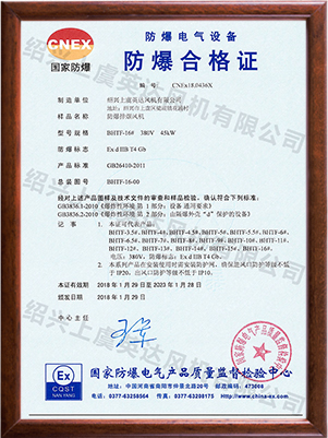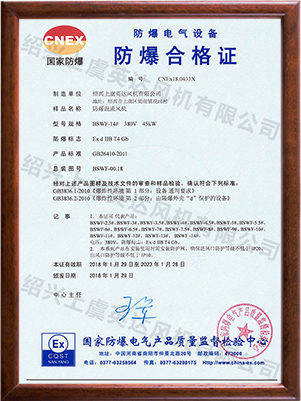 為適應防爆環境需要,風機可做成防爆風機,防(fáng)爆等(děng)級為EXdⅡBT4,適用於易燃、易爆氣體的場所。整機通過國家防爆認證。