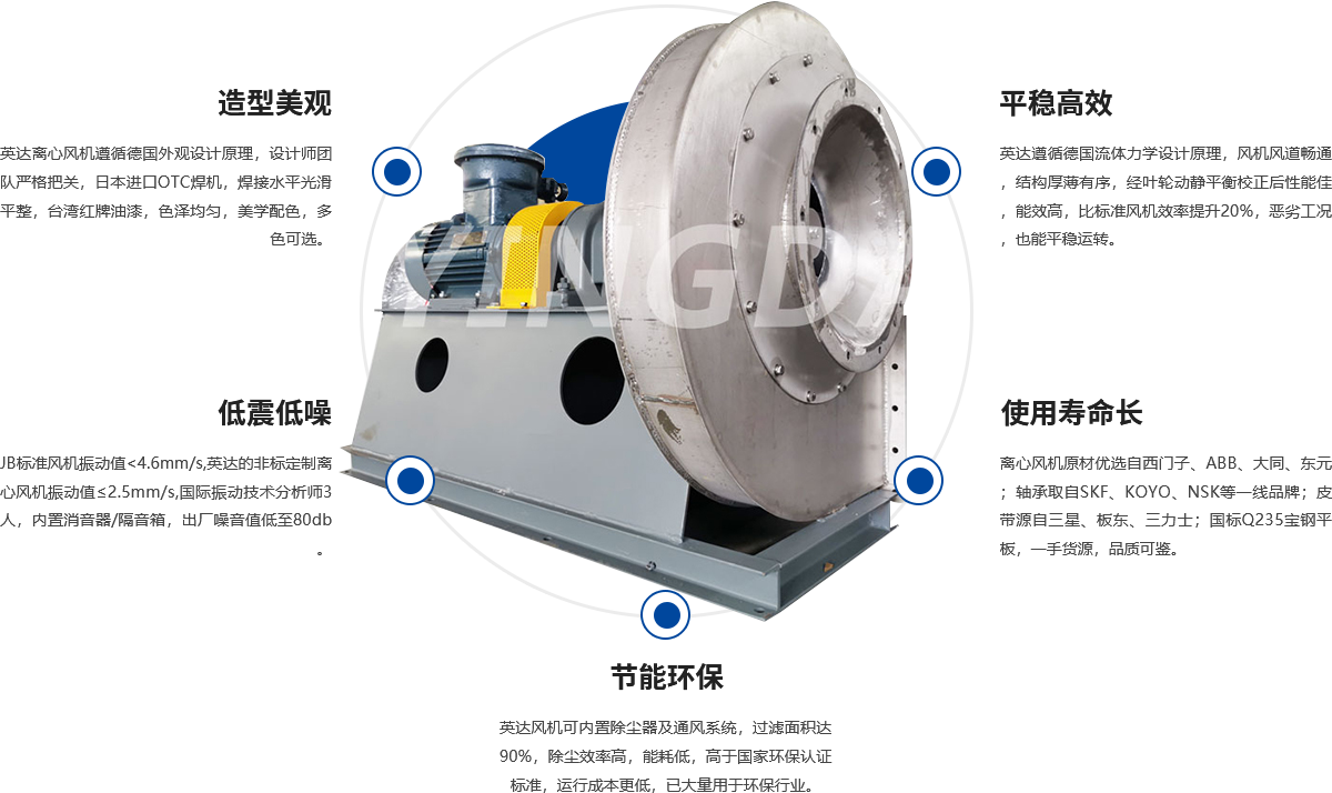 高壓離心通(tōng)風機廣泛用於(yú)環(huán)保行業、通風送風、粉塵送排風行業、工業爐(lú)行業等(děng)等等各(gè)個領域,是工(gōng)農業生產中主要耗能設備之一。離心式通風機(jī)是(shì)除塵通(tōng)風係統中四大件之(zhī)一, 是一種比較(jiào)精密的運轉機械,依靠葉輪的轉(zhuǎn)動在風機內部(bù)形成負壓,將外界氣體(tǐ)吸入並經葉輪流道和蝸殼(ké)排出風機。 離心式通風機主要由機(jī)殼、 葉輪、 機軸、 集流器、 排氣口(kǒu)、 軸承(chéng)箱(xiāng)體、聯軸器、 皮帶輪及底座等部件組成。