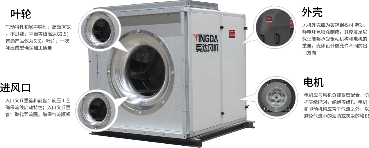 風機外殼應為鍍(dù)鋅鋼板材[選項:靜電環氧噴塗]製成,其厚度足以保證能(néng)夠承(chéng)受驅動機構和電機的重量。殼體設計應允許不同的出口方向(xiàng)。