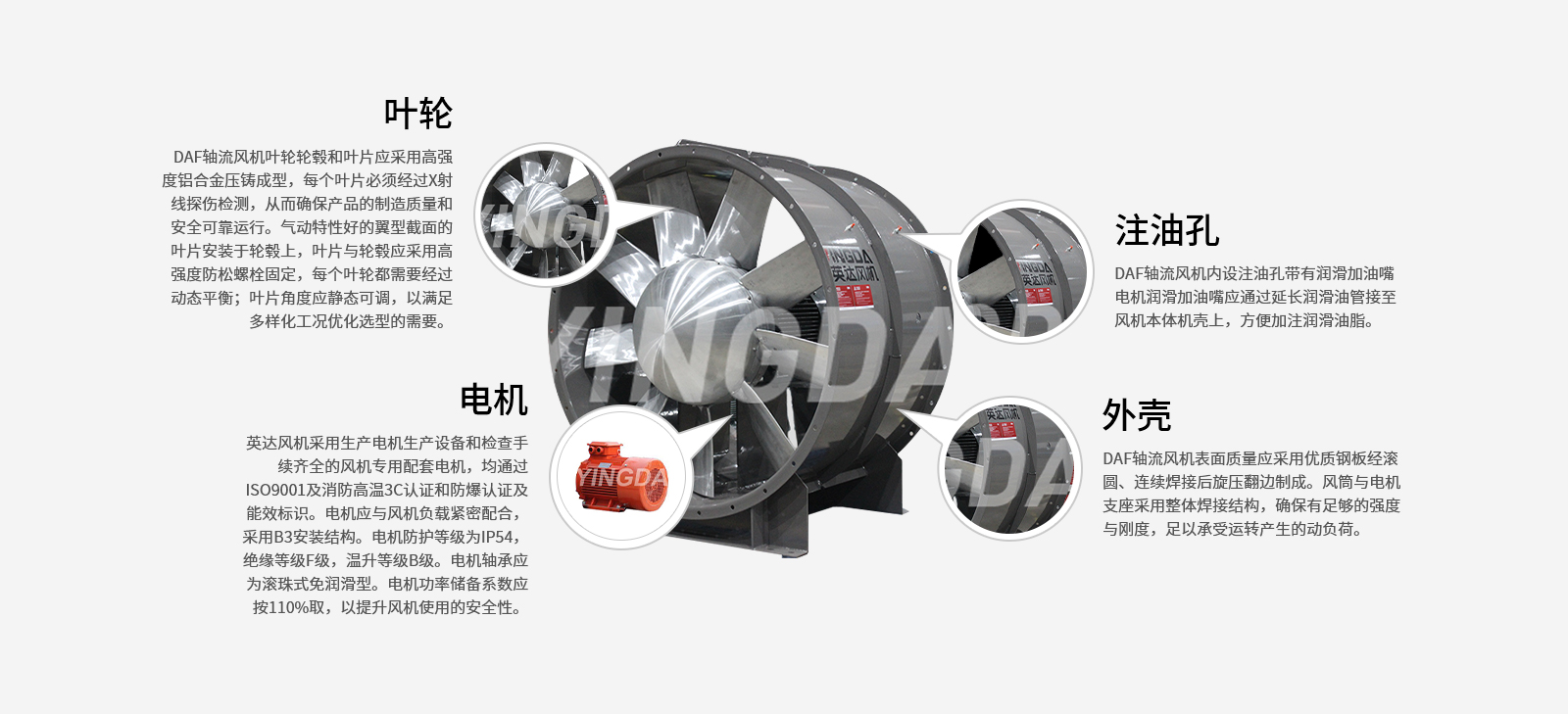 DAF軸流風機葉輪輪轂和葉片應采用(yòng)高強度鋁合金壓鑄成型,每個葉(yè)片必須經過X射線探傷檢測,從而確保產品的製造質量和安全可(kě)靠運行(háng)。氣動特性好的翼型截麵的葉片安裝於輪轂上,葉片與輪(lún)轂應采用高強(qiáng)度防鬆螺栓固定,每個葉(yè)輪都需要經過動態平衡;葉片角度應靜態可調,以滿足多樣(yàng)化工況優化選型的需(xū)要。