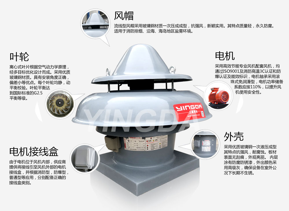 鋼製屋頂風機機殼為鋼板焊接(jiē)成形,玻璃鋼屋頂風機機殼(ké)為玻璃鋼一次(cì)成形,風機風帽為玻(bō)璃鋼一次成形。